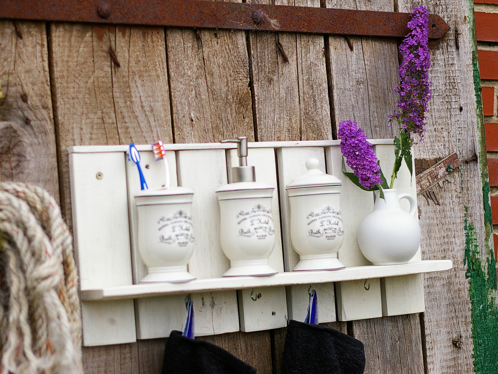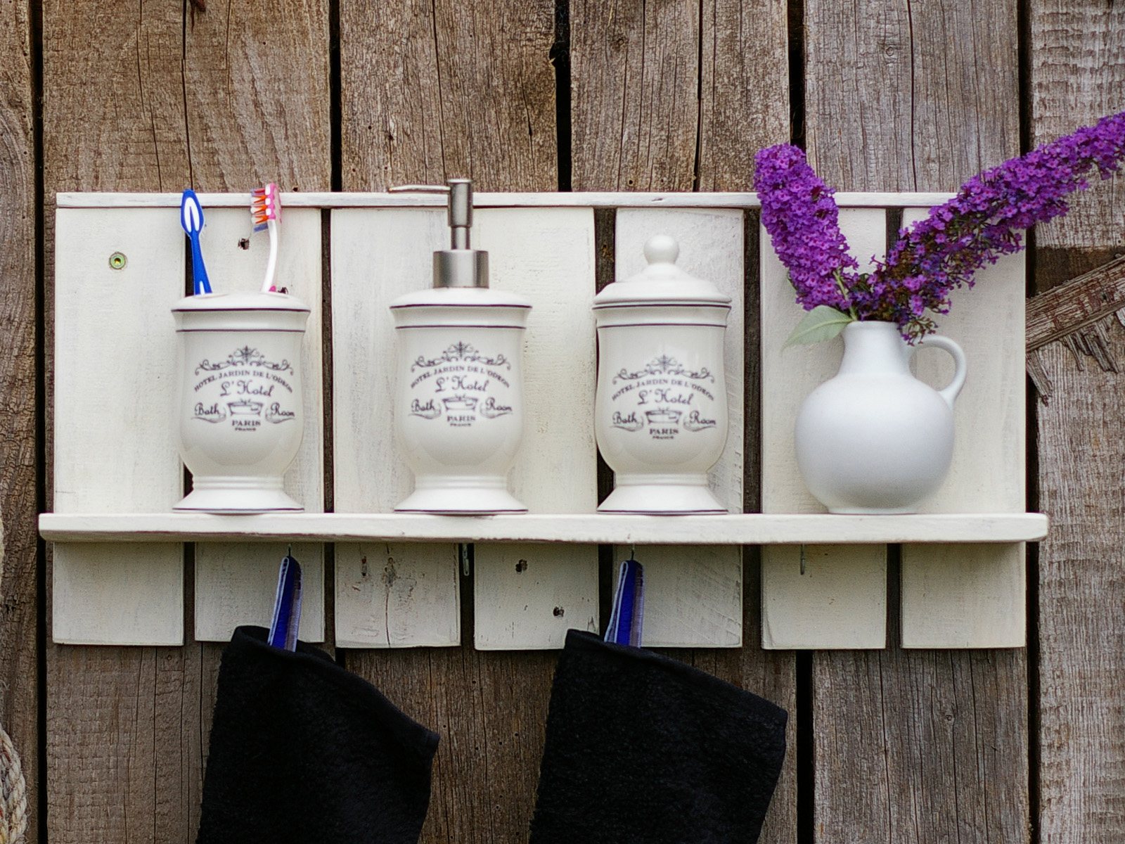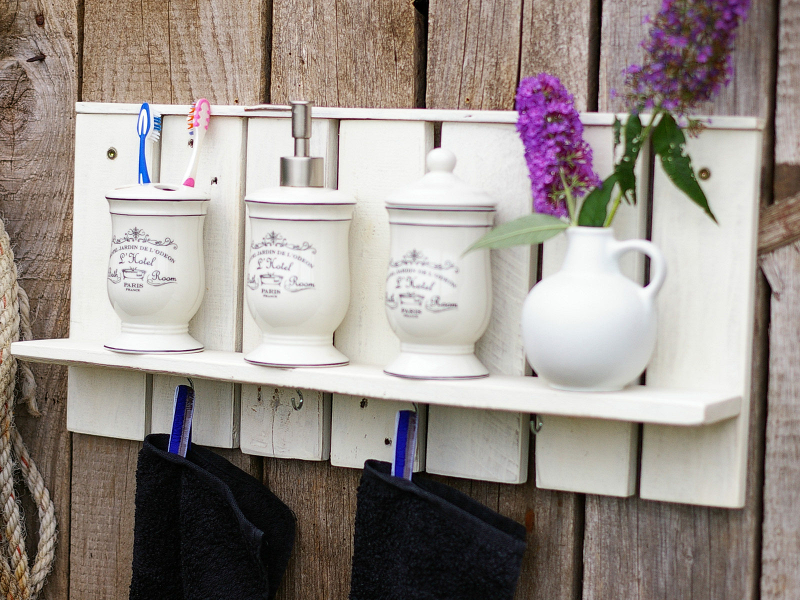 Anstelle der Tassen hängten wir ein paar Handtücher an die Haken,passende Accessoires auf das Bord und fertig ist das Badregal.