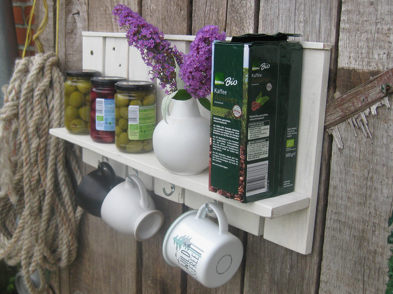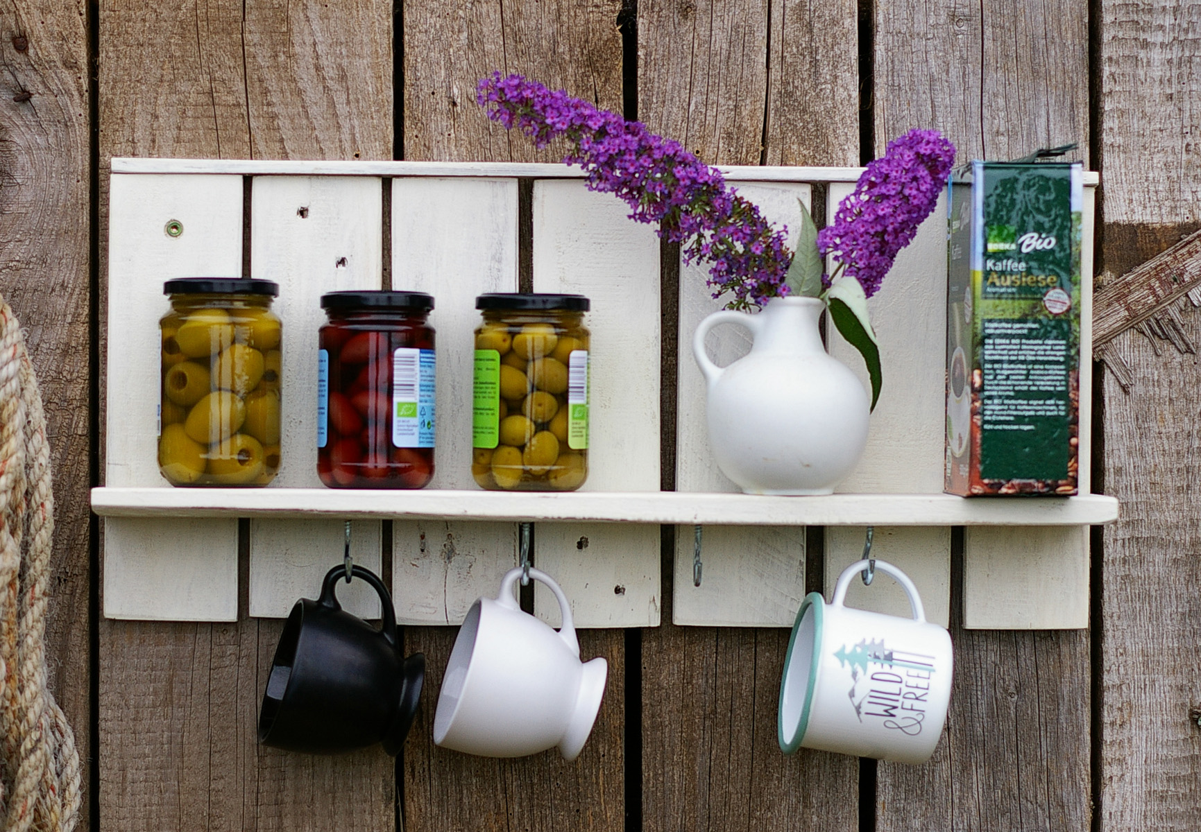 Nun haben wir nur ein paar Haken unterhalb des Bords angebracht, ein paar Tassen angehängt und Lebensmittel auf dem Bord plaziert und schon ist es ein schönes Küchenregal.